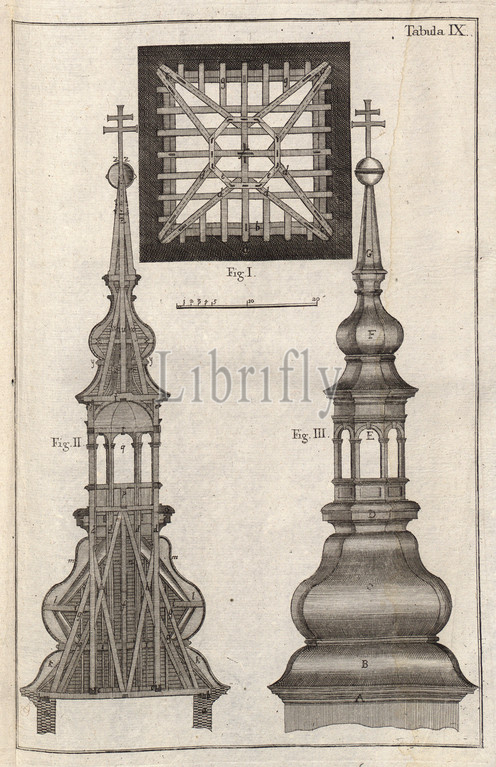 Construction drawing, roof truss 5, Illustrations, construction drawing, roof truss, 18th century, Tabula IX, p. 85, 1769, Caspar Walter, Zimmerkunst oder Anweisung wie allerley Arten von deutschen, welschen Thurnhauben, auch Kugelhelme, nach der neuesten Manier, zu Bedeckung der Kirchenthürme nicht nur zu entwerfen, sondern auch mit Holz zu verbinden, Augsburg, verlegt von den Gebrüdern Veith, 1769