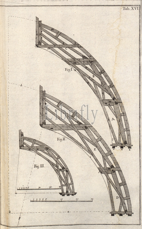 Construction drawing of a roof truss 8, Illustrations of construction drawing for a roof truss from the 18th century, Tabula XVI, p. 92, 1769, Caspar Walter: Zimmerkunst oder Anweisung wie allerley Arten von deutschen und welschen Thurnhauben, auch Kugelhelme, nach der neuesten Manier, zu Bedeckung der Kirchenthürme nicht nur zu entwerfen, sondern auch mit Holz zu verbinden: [...]. Augsburg: verlegt von den Gebrüdern Veith, 1769
