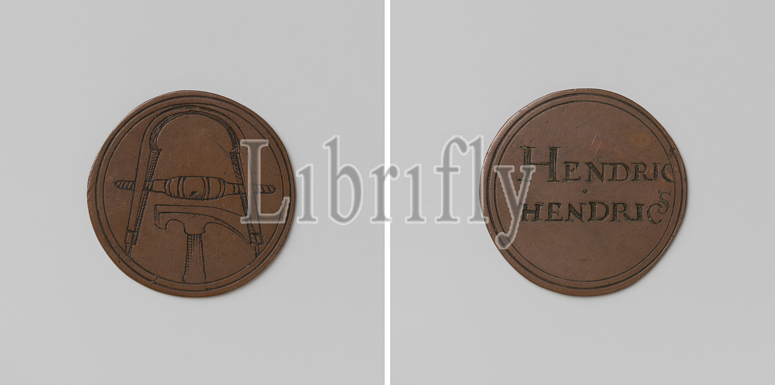 Cooper's Guild, Guild Medal of Hendric Hendrics, Copper Medal. Front: Cooper drawbar above Cooper hammer. Reverse: inscription, Hendric Hendrics, anonymous, Netherlands, c. 1400 - c. 1885, copper (metal), engraving, d 3 cm × w 4.11 gr