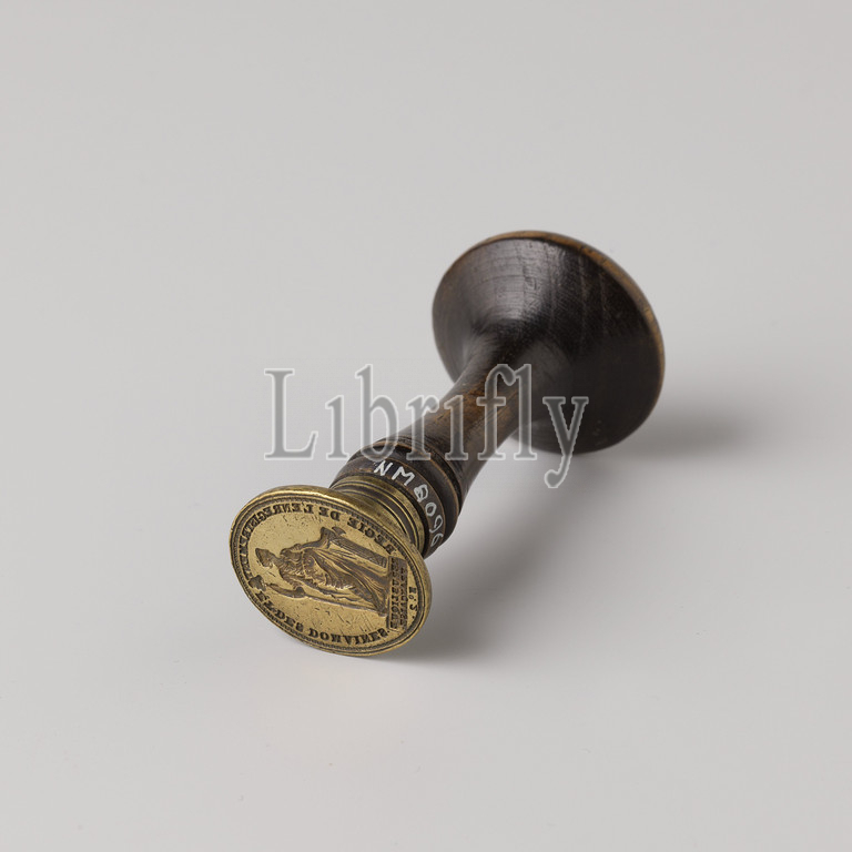Copper cachet showing the statue of liberty, Oval stamp with wooden handle with flattened head. On the stamp the Dutch Virgin, standing in profile to the right (on the stamps to the left), in the right hand the staff with freedom hat, the left hand leaning on the ax. Edge lettering: REGIE DE L 'ENREGISTREMENT ET DES DOMAINES. O .: REPUBLIQUE FRANCAISE No. 2, Batavian Republic, Netherlands, 1775 - 1825, wood (plant material), copper (metal), striking (metalworking), l 3.1 cm × w 2.1 cm × h 8 cm