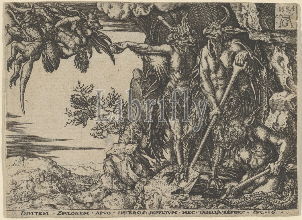 Copy, Rich Man Transported, Hell, Parable, Man, Lazarus, 1554, Engraving, Sheet, 3 1/8, 4 5/16, 8, 10.9 cm, Prints, after Heinrich Aldegrever, German, Paderborn ca., 1502–1555/1561, Soest, rich, man, carried, winged demons, upper left, landscape, city, background, right, three, shovels digging, hole, demon, left gestures, towards, group, flying figures
