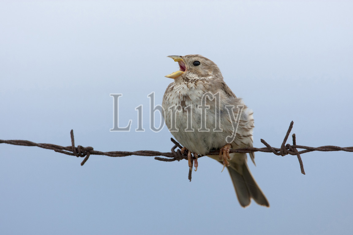 Corn Bunting, barbed wire, singing, Lesvos, Greece, Emberiza calandra, nature, bird, animal, wildlife, wild, fauna, natural, feather, sky, beak, wing, outdoor, freedom, colourful, Liszt, Natural History, ornithology, vertebrate animals, photography, color image