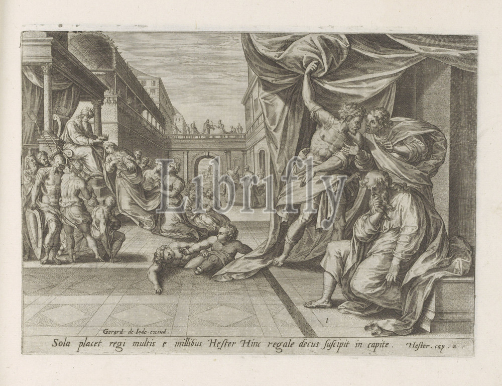 Coronation, Ester History, Ester, series title, Historia Asuerij, Thesaurus sacrarum historiaru, m, veteris testame, n, ti, elega, tissimis imaginibus expressu, excelle, tissimoru, hac arte viroru, opera, now, c primu, luce, editus, Ester becomes left, king Ahasuerus, queen crowned, foreground three men watch, middle man, Estonian foster father Mordecai, asks, doing, background you, see, Esther, led, king, performance, reference, Latin, Bible text, Est, 2, Print, part, album, way, King Ahasuerus, crowning, Hans Collaert, I, attributed, Antwerp, 1579, paper, engraving
