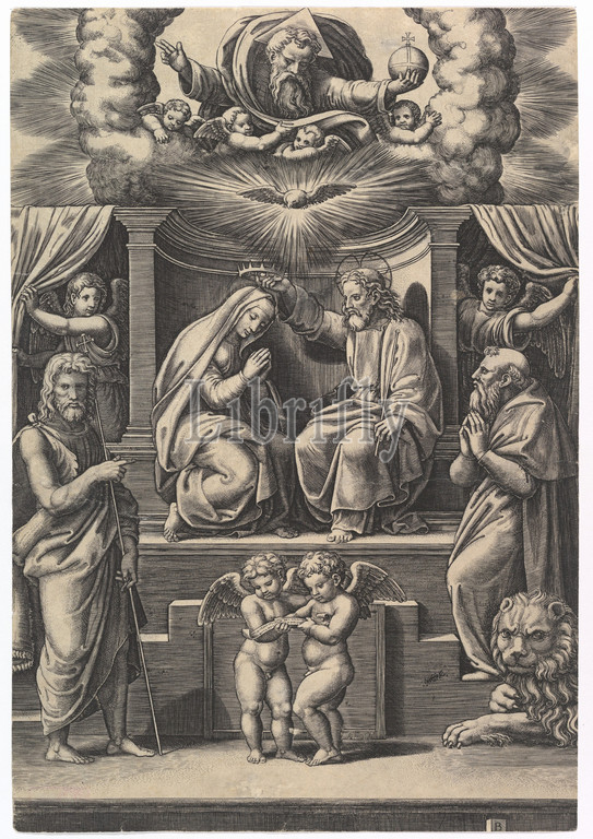 The Coronation of the Virgin, at lower left stands St John the Baptist, at lower right St Jerome, God the father above, 1530–60, Engraving, sheet: 13 13/16 x 9 1/2 in. (35.1 x 24.2 cm), Prints, Master of the Die (Italian, active Rome, ca. 1530–60)