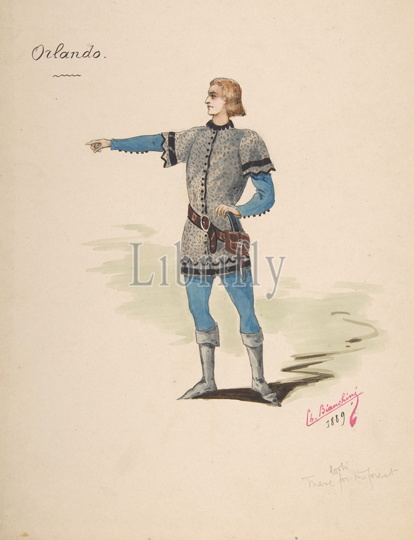 Costume Design, Orlando, 1889, Pen, black ink, watercolor, graphite underdrawing, 12 3/8 x 9 7/16, 31.5 24.0 cm, Drawings, Charles Bianchini, French, Lyons, 1860–1905, Paris