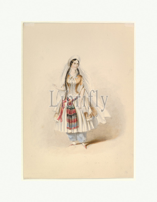 Costume Study for Blonde in the 'Abduction from the Seraglio' by W.A. Mozart, ca. 1830–50, Watercolor, over graphite, gum arabic, Sheet: 11 1/4 × 8 1/16 in. (28.6 × 20.5 cm), Drawings, Johann Georg Christoph Fries (German, Nuremberg 1788–1857 Regensburg)