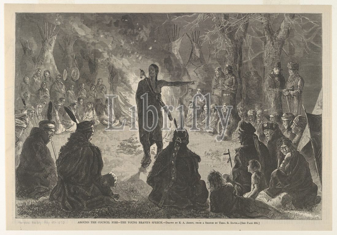 Around the Council Fire, The Young Brave's Speech (Harper's Weekly, May 10, 1873), May 10, 1873, Wood engraving, Image: 9 1/8 × 13 9/16 in. (23.1 × 34.5 cm), Prints, Theodore Russell Davis (American, 1840–1894), After Edwin Austin Abbey (American, Philadelphia, Pennsylvania 1852–1911 London)