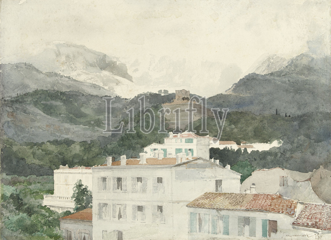 Country houses, foot, mountains, high mountains, horizon, La Turbie, Jules Ferdinand Jacquemart, 1875, paper, watercolor, paint, pencil, chalk, brush