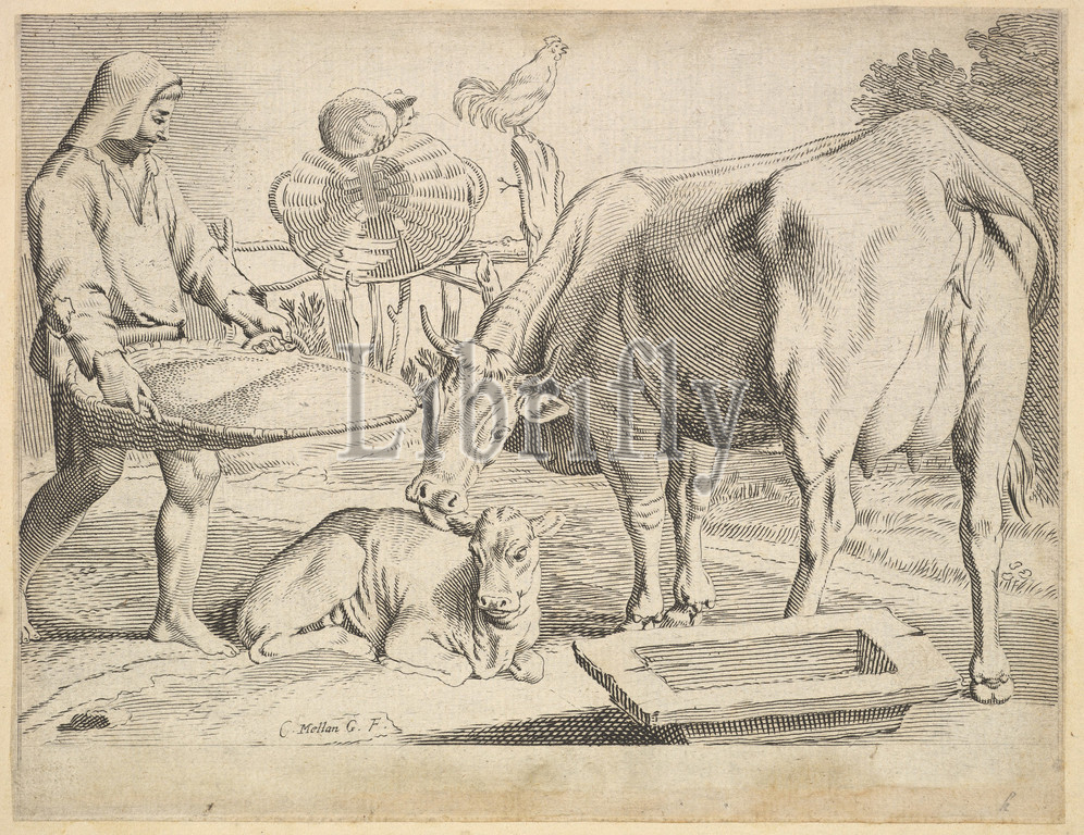 Country Scene, Peasant, Cow, Calf, Engraving, second state, two, sheet, 5 7/8 x 7 11/16, 15 19.5 cm, Prints, Claude Mellan, French, Abbeville, 1598–1688, Paris