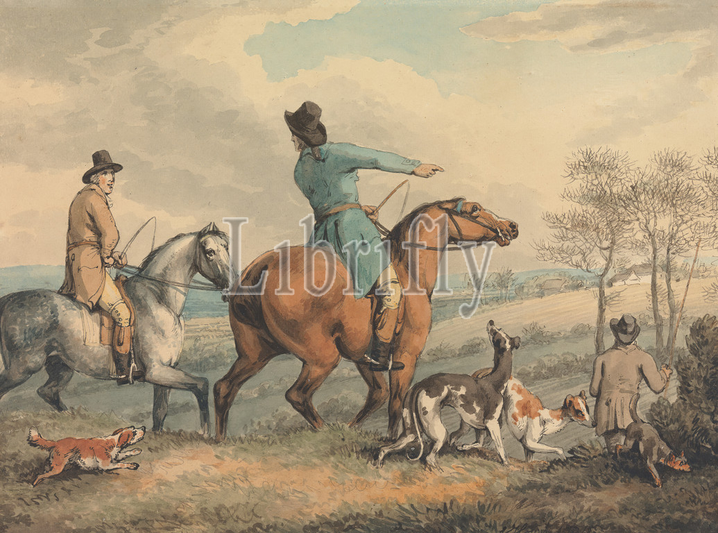 Coursing: Setting Out, Samuel Howitt, 1756–1822, British, 1794, Watercolor, with pen, in black ink, gray ink, and brown ink on medium, slightly textured, cream, wove paper, Sheet: 6 7/8 × 9 3/16 inches (17.5 × 23.3 cm), dogs (animals), horseback riders, horseback riding, horses (animals), hounds (dogs), hunt, hunters, hunting, landscape, men, sporting art, trees