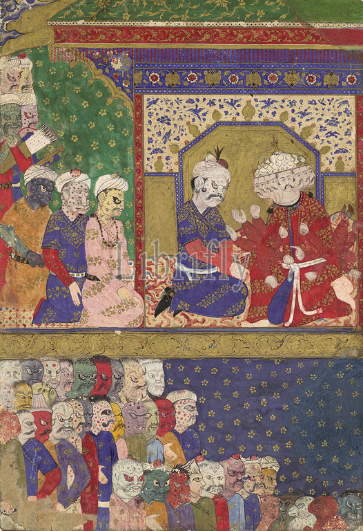 'The Court of Ravana', Folio from a Ramayana, ca. 1605, Attributed to India, Opaque watercolor and gold on paper, Painting: H. 10 7/8 in. (27.6 cm), Codices, The page comes from a copy of the Ramayana probably made for the Mughal courtier Bir Singh Deo of Datia. Inspired by fifteenth-century Indian and Persian painting, this folio is unique from the others in this manuscript