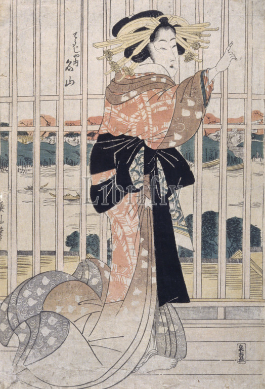 The Courtesan Meizan of the Chōjiya, Kikukawa Eizan (Japanese, 1787-1867), Edo, about 1809-1813, ink on paper, color woodblock print, 14-3/4 x 10 in. (image, trimmed all around), Signed by artist: Eizan Publisher's mark: Senichi ban, the mark of Izumiya Ichibei of Kansendō, series, Temporary Quarters in the New Yoshiwara (Shin Yoshiwara kartitaku), Asian Art