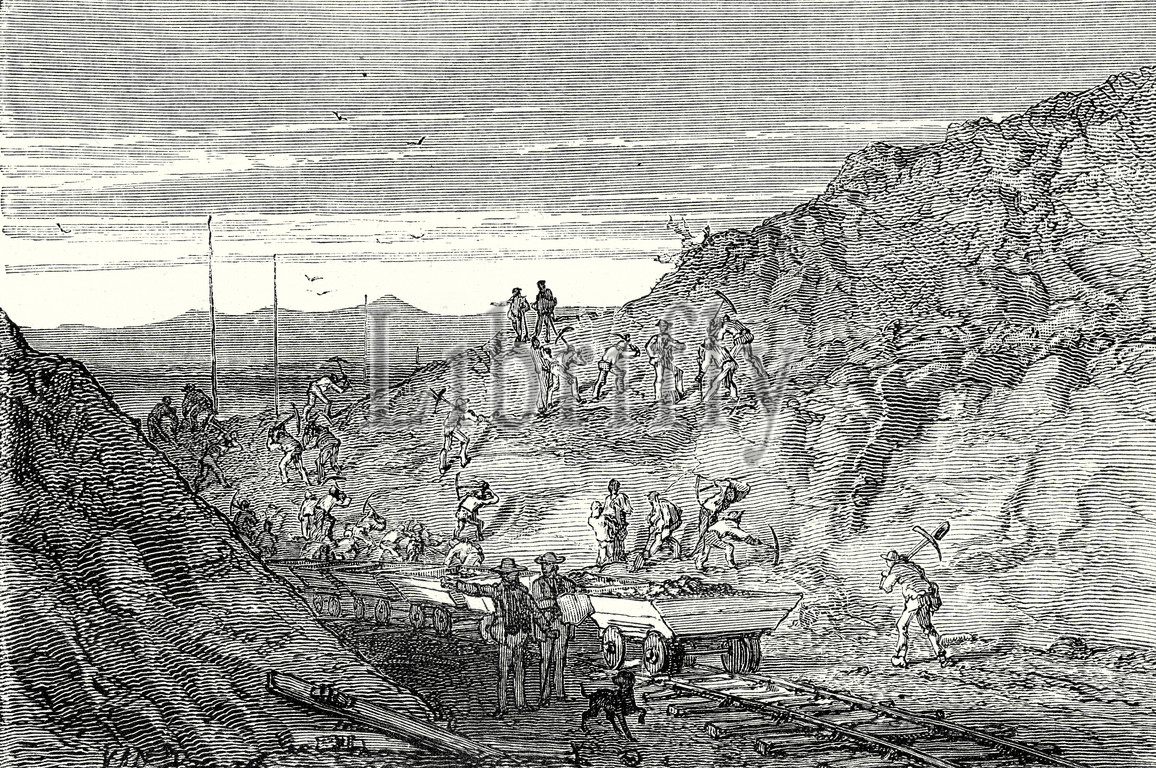 creation, trench, techlogy, work, mechanical, 19th century, train, transport, travel, track, transportation, rail, railroad, traffic, railway, 19th century engraving, wagon, rails, pickaxe, old print, vintage, old print, 19th century, victorian, retro, quint, lox, engraving