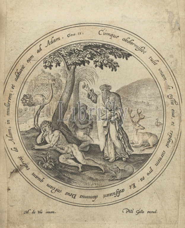 Creation, Eve History, Adam, Eve, series title, God makes Adam fall asleep, removes, rib, creates Eve, margins, frame, Bible quote, Gen, Latin, print, part, album, creation, Crispijn van de Passe, I, Antwerp, 1580, 1588, paper, engraving