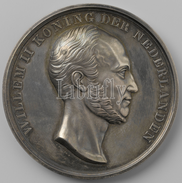 Creation, statue, William I, Prince, Orange, honor, William II, King, Netherlands, black-and-white Medal, Front, man's bust inside, inside, Reverse, equestrian statue, pedestal, decorated, crowned coats, arms within, inscription, cut off, dating, Hague, Alfred Emile O'Hara de Nieuwerkerke, 1845, black-and-white, metal, striking, metalworking