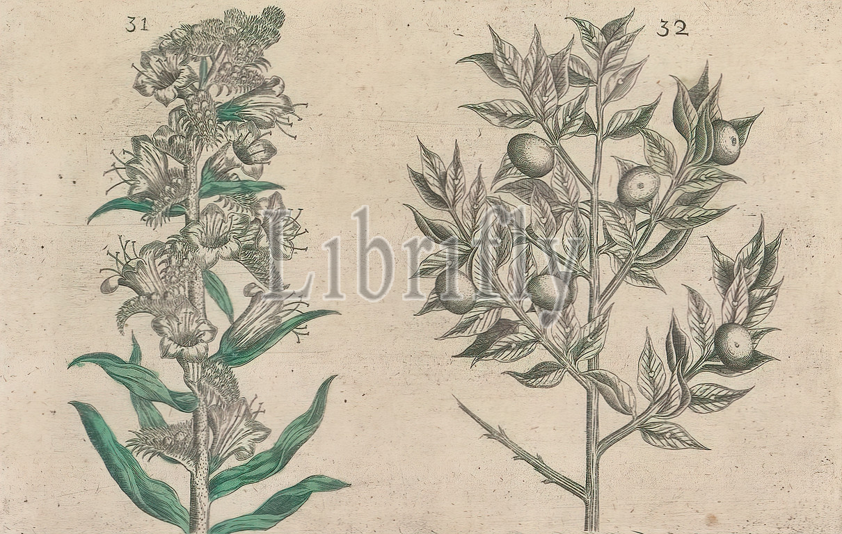 Crooked neck (Anchusa arvensis) and mouse thorn (Ruscus aculeatus), Crooked neck and mouse thorn. FIGs. 31 and 32 on a sheet hand numbered 17. In: Anselmi Boetii de Boot I.C. Brugensis & Rodolphi II. Imp. Novel. medici a cubiculis Florum, Herbarum, ac fructuum selectiorum icones, & vires pleraeque hactenus ignotæ. Part of the album with sheets and plates from De Boodts herbarium from 1640. The twelfth of twelve albums with watercolors of animals, birds and plants known around 1600, commissioned by Emperor Rudolf II, anonymous, 1604 - 1632 and/or 1640, paper, ink, watercolor (paint), engraving, h 135 mm × w 205 mm h 160 mm × w 230 mm