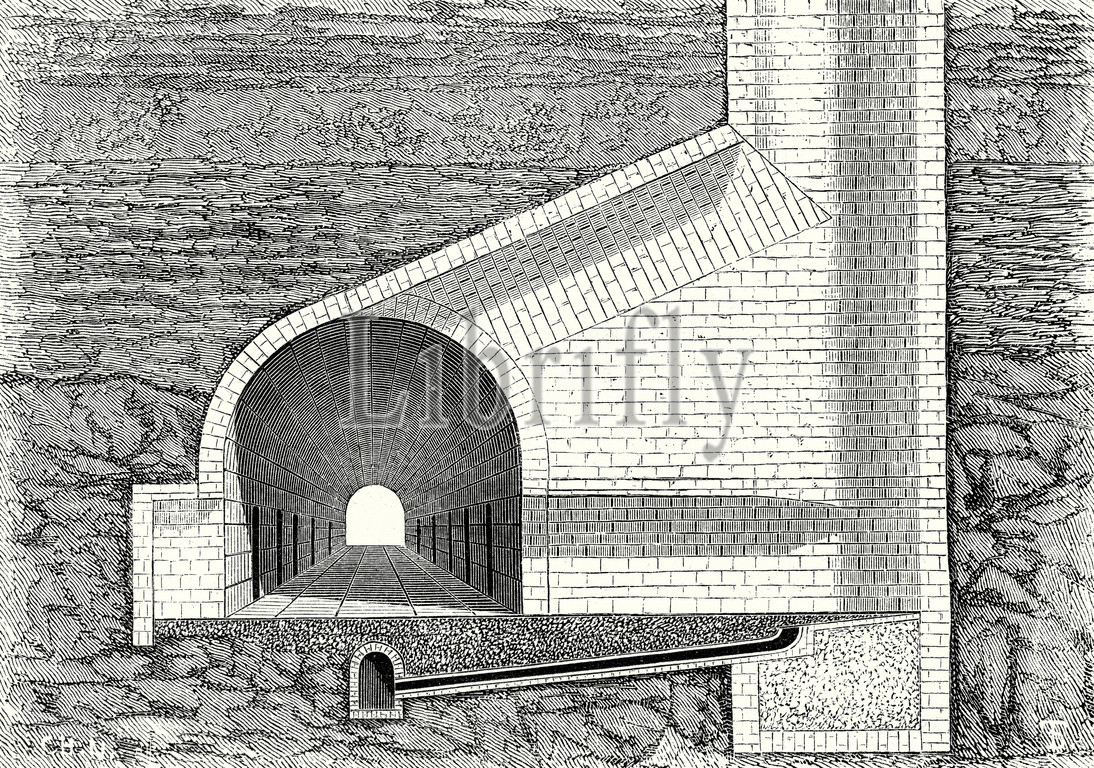 cross section, passageway, tunnel, ventilation shaft, ventilation, techlogy, mechanical, 19th century, train, transport, travel, track, transportation, rail, railroad, traffic, railway, 19th century engraving, age of steam, vintage, old print, 19th century, victorian, retro, quint, lox, engraving