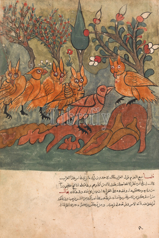 Crow Spy Talks, King, Owls, Ministers, Folio, Kalila wa Dimna Manuscript, 18th century, Attributed, Egypt, Syria, Ink, opaque watercolor, paper, 12.5, high 8.87, wide, 31.8 cm high 22.6 wide, Codices