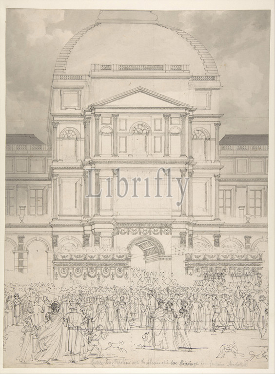 Crowd, Front, Tuileries Palace, Wedding, Napoleon, Marie-Louise, Austria, ca, 1810, Pen, gray ink, brush, wash, black chalk, 16 3/8 x 12 1/8, 41.6 30.8 cm, Drawings, Charles Percier, French, Paris, 1764–1838, Pierre François Léonard Fontaine, Pontoise, 1762–1853, drawing, design, plate nine, 1810 book, Description des, érémonies, et, des, fêtes, qui, ont, eu, lieu, pour, le, mariage, de, S.M, l'Empereur Napolé, avec, S..I, Madame l'Archiduchesse, d'Autriche, par, Charles, Percier, P