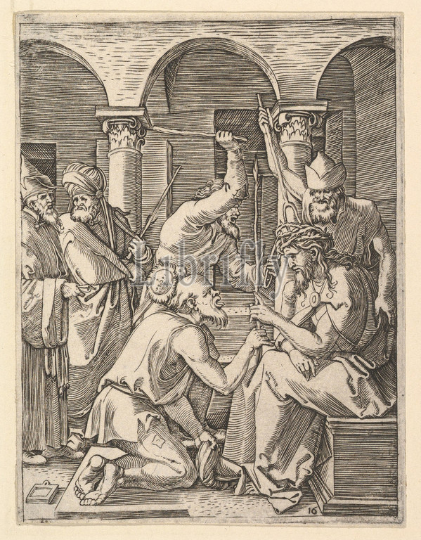 The Crown of Thorns; men putting crown of thorns on Christ who blesses kneeling man, after Dürer, ca. 1500–1534, Engraving; second state of three, Sheet: 5 3/16 × 3 7/8 in. (13.2 × 9.9 cm), Prints, Marcantonio Raimondi (Italian, Argini (?) ca. 1480–before 1534 Bologna (?)), After Albrecht Dürer (German, Nuremberg 1471–1528 Nuremberg)