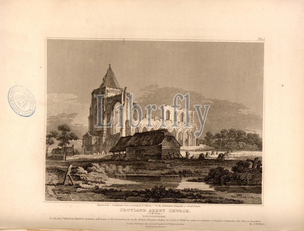 Croyland Abbey Church, S. W. View, Lincolnshire, Crowland Abbey Church in Lincolnshire, signed: Engraved by Dauthmare from a Drawing by P. S. Munn; Published by Longman & Co, Fig. 26, Pl. I, after p. 84, Munn, Paul Sandby (drawing); Dauthmare (engraving); Longman & Co. (published), 1812, John Britton: The architectural antiquities of Great Britain: represented and illustrated in a series of views, elevations, plans, sections and details of various ancient English edifices: with historical and descriptive accounts of each. Bd. 4. London: J. Taylor, 1807-1826