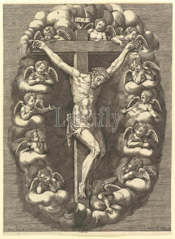 Crucified Christ Surrounded, Mourning Angels, 1575–1679, Engraving, sheet, 13 3/16 x 9 5/8, 33.5 24.4 cm, trimmed, Prints, Anonymous, Italian, 16th century, After Giorgio Ghisi, Mantua ca., 1520–1582, Mantua, Impression trimmed, lower margin