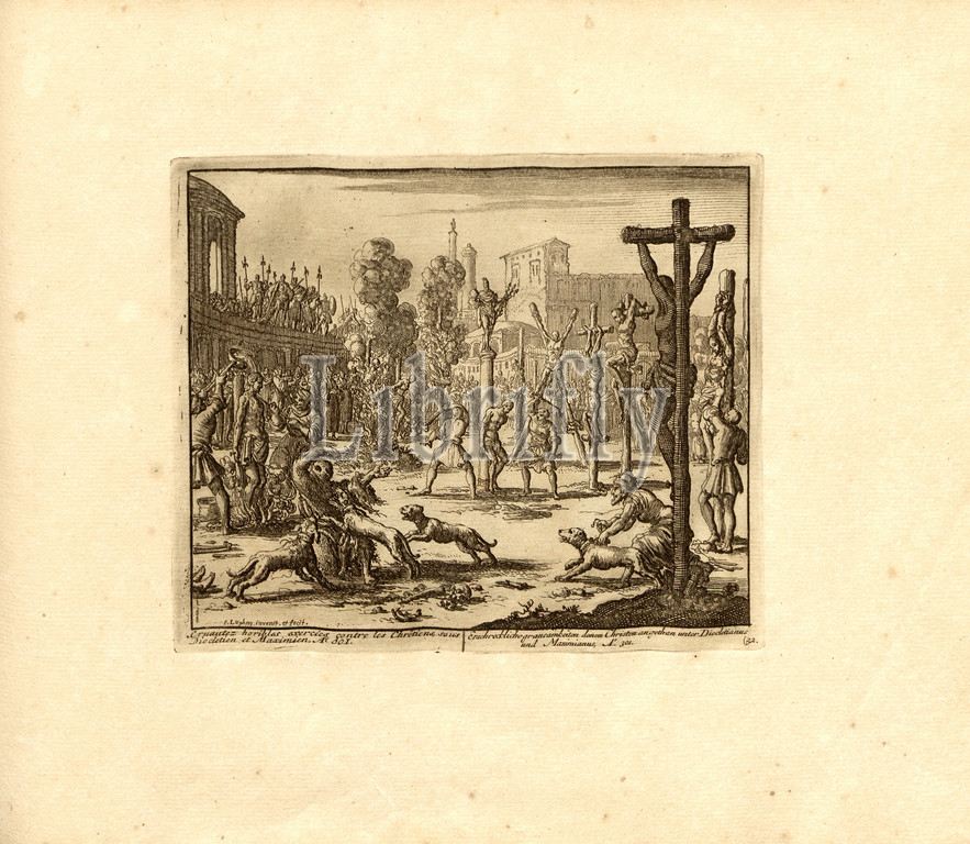 Cruel Horris exercised against Christians, under Diocletian and Maximian, Anno 301, Parallel title: Terrible atrocities committed by Christians under Diocletianus and Maximianus, A nn o 301, signed: F. Luyken invenit et fecit, copper engraving, 32.), p. 73, Luyken, Jan (inv. et fec.), Jan Luyken: Théâtre des martyrs: depuis la mort de J.Christ jusqu'à present: représenté en très belles tailles-douces = Schau-Bühne der Martyrer; gezeichnet und in Kuppfer gestochen. Leyde: chez Pierre Van der Aa, [1711]