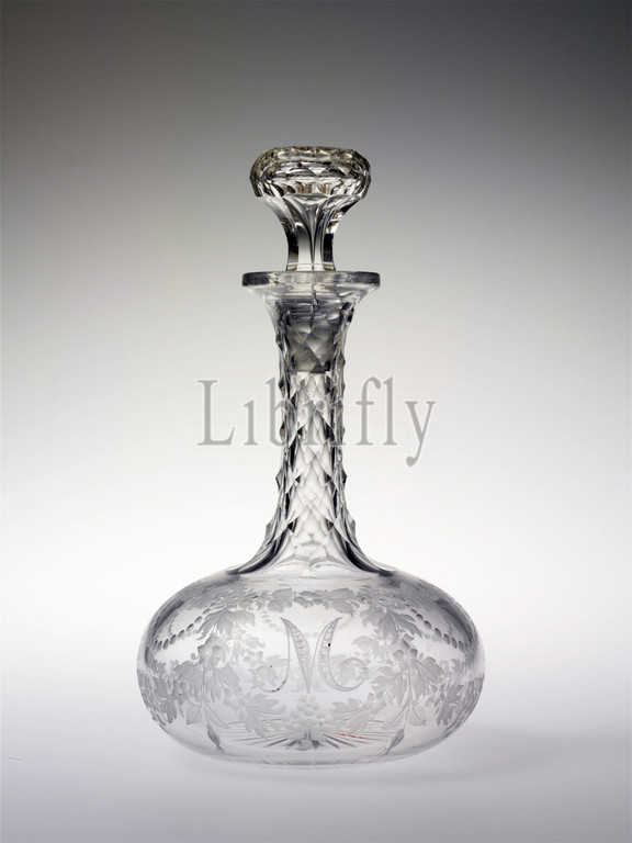Cruet, 1860–70, Made in East Cambridge, Massachusetts, United States, American, Blown, cut, and engraved glass, H. 7 in. (17.8 cm); Diam. 4 in. (10.2 cm), Glass, Louis F. Vaupel mastered the art of engraving in Germany before immigrating to the United States, where he eventually became the superintendent of the New England Glass Company’s engraving department. He decorated a number of pieces for his family, and this cruet bears the initial “M” for his daughter, Minette