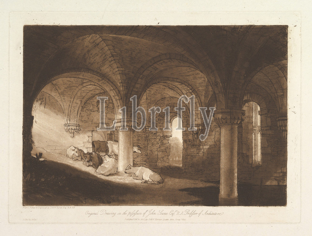 Crypt, Kirkstall Abbey, Liber Studiorum, part VIII, plate 39, February 11, 1812, Etching, aquatint, mezzotint, second state, four, plate, 7 x 10 7/16, 17.8 26.5 cm, Prints, Turner distilled, ideas, landscape, Latin, Book, Studies, series, seventy prints, plus, frontispiece published, 1807, 1819, establish, compositions, brown watercolor, drawings, etched outlines, copper plates