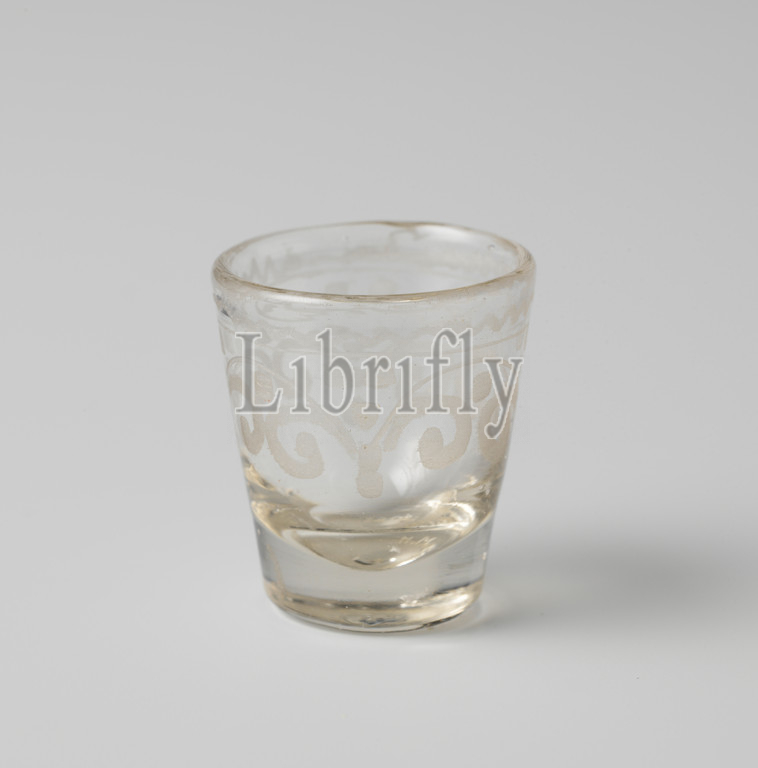 Cup decorated with engraved zigzag edging above volutes and balls, Cup of clear colorless glass with solid bottom, decoration in wheel engraving: zigzag edge above volutes and bulbs., anonymous, Germany (possibly), c. 1750 - c. 1800, glass, engraving, h 3.4 cm × d 3.0 cm