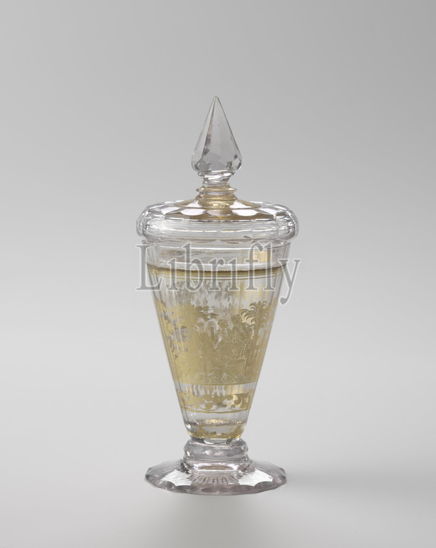 Cup on foot with lid made of Zwischengold glass, Slightly conical foot with polished decoration. Faceted disk, polygonal faceted, conical chalice. On the chalice, leaves above a stylized edge, in gold leaf and engraving a fountain with a water-spouting dolphin for a balustrade with garden vases, a gallant scene and a Chinese garden wall with a basket of flowers., anonymous, Bohemen, c. 1720 - c. 1740, glass, grinding, h 12.7 cm × d 7.8 cm