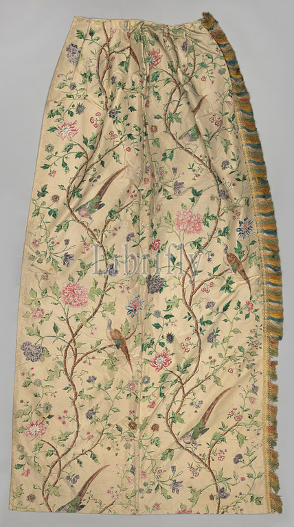 Curtain, painted silk decorated, flowers, birds, painted silk, contour drawing, printed, fine white ripple side, hand-painted painting, pattern, consists, ascending, wavy branching, flowering stem, two pheasants, seated, green branch winds, lotus, red, white large purple, pink-red peony, blue, pink, purple, pink carnation, fantasy flowers, yellow, bleu, leaves resemble, chrysanthemums, curtain consists, two tracks, short frills, sides, long frills, bottom, striped green, salmon, white, light brown, starting, zigzag pattern, knotted, Lining, fine twined light brown cotton, 20th century shantung, under, white satin, France, 1750, 1775, silk, cotton, textile