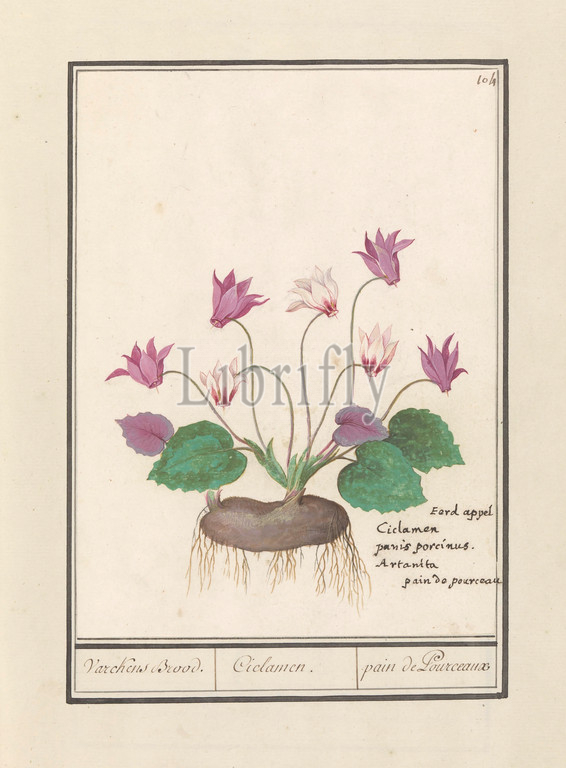 Cyclamen, Varckens Bread, Ciclamen, pain de Pourceaux, title, object, Numbered top right, 104, Latin name, Part, second album, drawings, flowers, plants, Ninth, twelve albums, animals, birds, 1600, commissioned, Emperor Rudolf II, explanation, Dutch, Latin, French, Flowers, NAME, Anselmus Boetius de Boodt, 1596, 1610, paper, watercolor, paint, deck paint, ink, pen