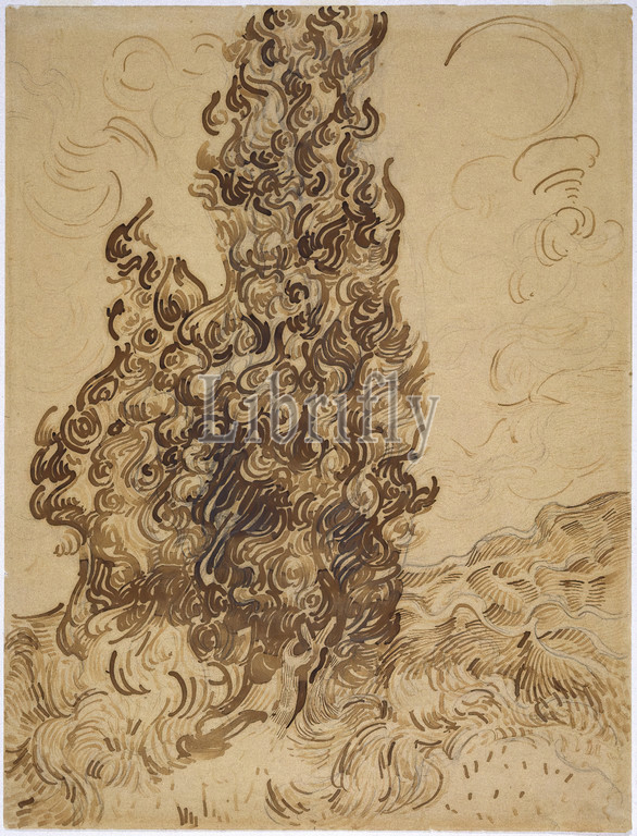 Cypresses, Les Cyprès, Vincent van Gogh, Dutch, 1853-1890, Brown ink, graphite, wove Latune et Cie Balcons paper, France, June 1889, 24 3/8 x 18 5/8, 61.9 x 47.3 cm, 1889, 19thC, black, brown, Cypresses, drawing, dutch, Dutch art, earth tones, graphite, ink, Latune et Cie Balcons paper, nature, ndd12, paper, pen, quill, reed pen, sky, swirls, trees, van Gogh, Vincent van Gogh, ceramic