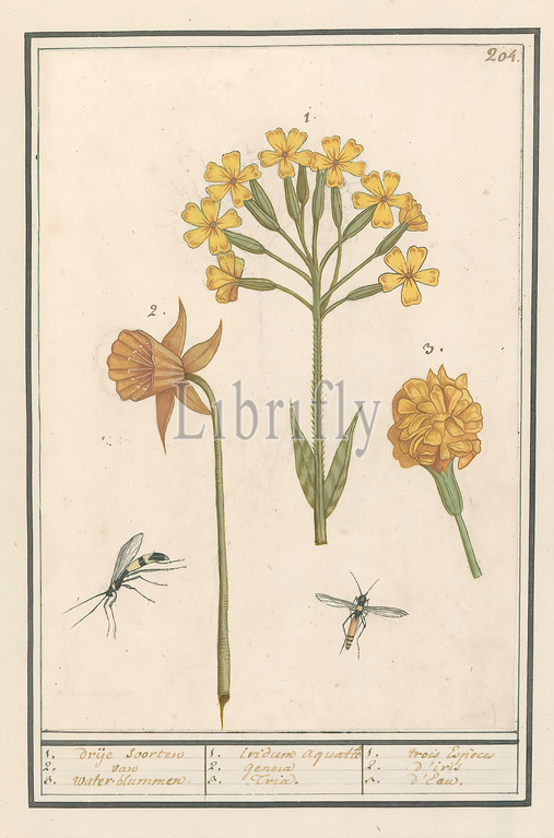 Daffodil, Narcissus, Golden primrose, Primula veris, Tagetes 1 2 3, free species, water-based blooms, 1, iridum aquatic genera Tria, trois Espèces d'iris d'Eau, title, object, Three yellow flowers, daffodil, golden primrose, marigold, Hereby, two winged insects, Numbered top right, 204, Part, third album, drawings, flowers, plants, Tenth, twelve albums, animals, birds, 1600, commissioned, Emperor Rudolf II, explanation, Dutch, Latin, French, Flowers, narcissus, NAME, insects, Anselmus Boetius de Boodt, 1596, 1610, paper, watercolor, paint, deck paint, chalk, brush