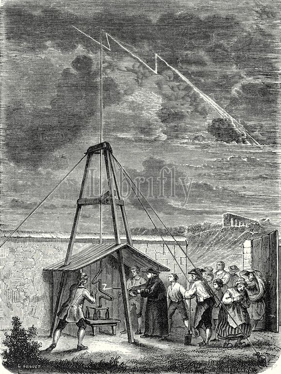 experiment, 10 may, 1752, 18th century, 18th century experiment, dalibard, marly, demonstration, presence of electricity, electricity, lightning, thunder, thunder and lightning, thunderclouds, storm, science, scientific, scientific experiment, 19th century engraving, people, old print, vintage, old print, 19th century, victorian, retro, quint, lox, engraving