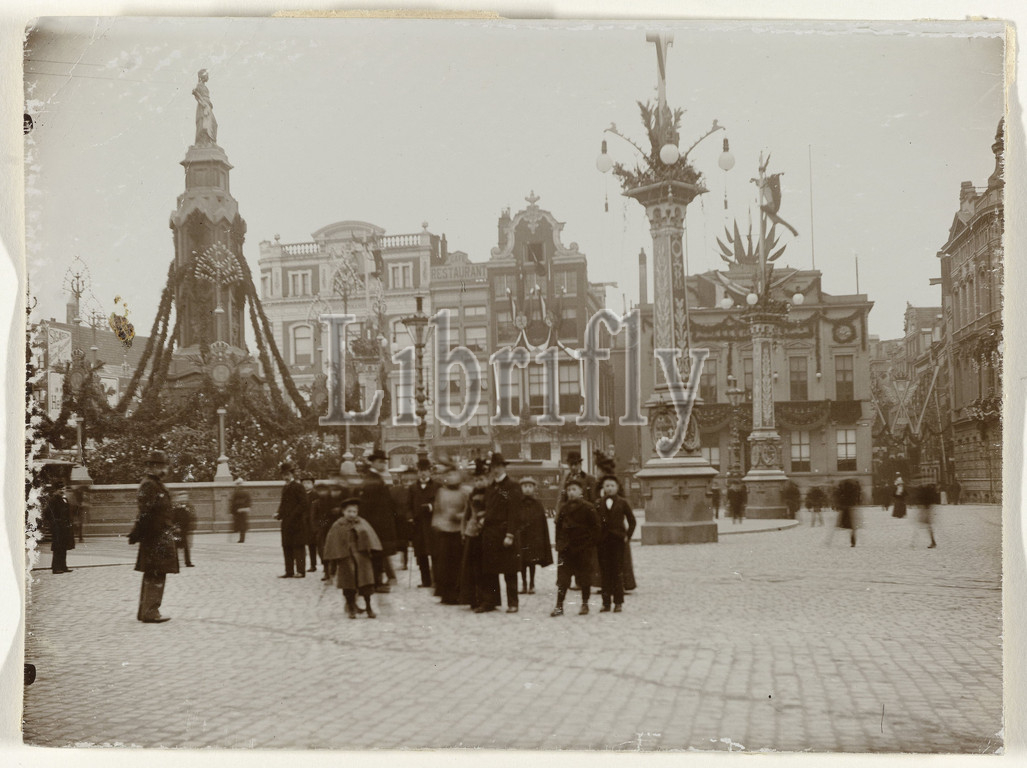 De Dam, decorated statue 'De Eendracht', better, 'Naatje van de Dam', Amsterdam, Netherlands, De Dam, statue 'De Eendracht', better, 'Naatje van de Dam', decoration, visit, Queen Wilhelmina, Prince Hendrik, occasion, marriage, background right, Kalverstraat, Amsterdam, Netherlands, anonymous, Amsterdam, 1901, photographic support, height 120 mm, width 160 mm