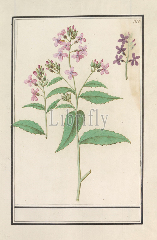 Damask flower, Hesperis matronalis, Numbered top right, 315, Part, fourth album, drawings, flowers, mushrooms, Eleventh, twelve albums, animals, birds, plants, 1600, commissioned, Emperor Rudolf II, explanations, Dutch, Latin, French, Anselmus Boetius de Boodt, 1596, 1610, paper, watercolor, paint, deck paint, chalk, brush