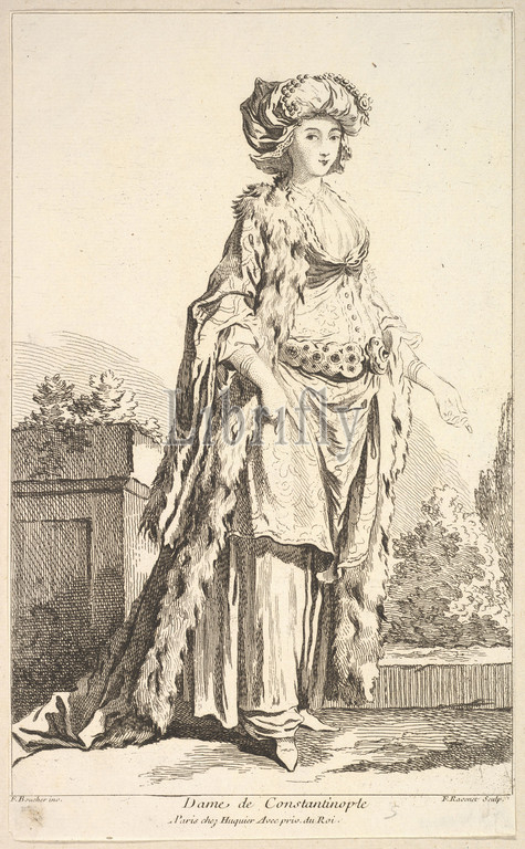 Dame de Constantinople, Recueil diverses fig.res étrangeres Inventées par F, Boucher P.tre du Roy et Gravées, Ravenet, Collection, Various Foreign Figures, Devised, F, Boucher, Painter, King, Engraved, etched, plate 5, 18th century, Etching, engraving, Sheet, 10 7/16 x 6 5/16, 26.5 16 cm, Prints, Simon Francis Ravenet, the elder, French, 1706, 1721–1774, After François Boucher, Paris, 1703–1770