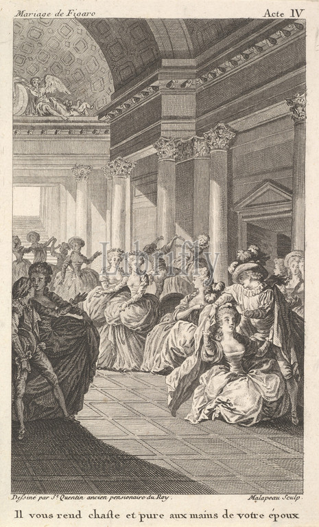 Dancing couples surround four standing women in a barrel-vaulted hall, from a series of five illustrations after Jacques Philippe Joseph de Saint-Quentin for 'The mad day, or the marriage of Figaro' (La Folle journée, ou le mariage de Figaro) by Pierre Augustin Caron de Beaumarchais, ca. 1784, Etching with engraving, sheet: 6 3/8 x 4 in. (16.2 x 10.1 cm), Prints, After Jacques Philippe Joseph de Saint Quentin (French, born Paris, 1738), Claude Nicolas Malapeau (French, Paris 1755–1803 Paris)