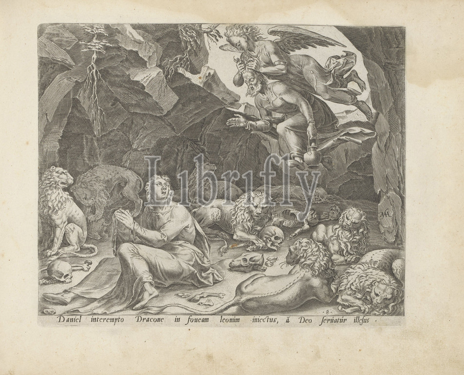 Daniel, lion's den Van den Bel, den Draeck, Babel, series title, History, Bel, dragon, Den Grooten Figuer-Bibel, trapped, lion's den, seven lions, angel brings, prophet Habakkuk, Habakkuk, food, God's request, Under, representation, explanatory text, Latin, Print, part, album, carried, hair, angel, brings food, sits unharmed, lions, Philips Galle, 1565, 1646, paper, engraving