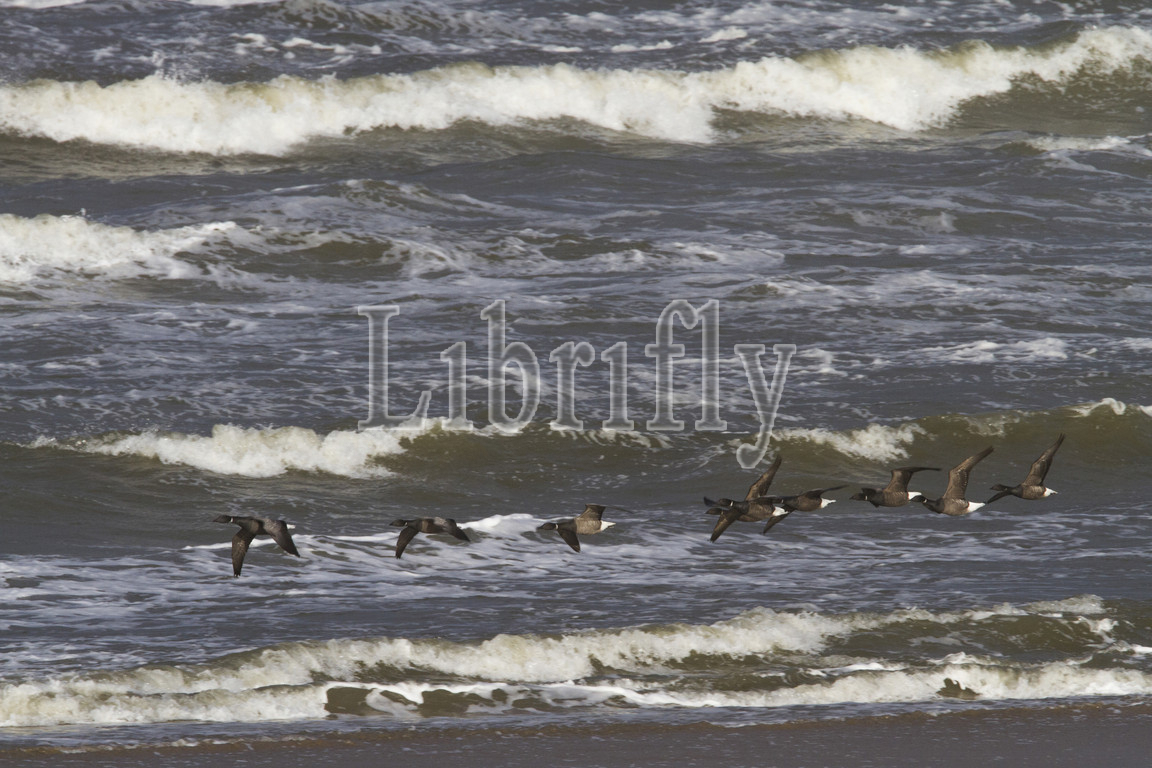 Dark-bellied Goose flock flying over surf of North Sea, Netherlands