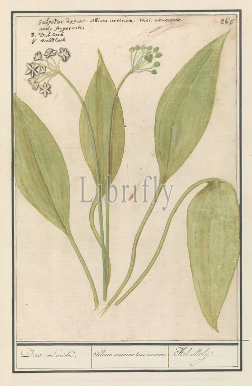 Daslook, Allium ursinum, Das Look, Allium arsinum taxi nemorence, Ail Molij, title, object, Numbered top right, 265, Top left, name, three languages, Part, third album, drawings, flowers, plants, Tenth, twelve albums, animals, birds, 1600, commissioned, Emperor Rudolf II, explanations, Dutch, Latin, French, Anselmus Boetius de Boodt, 1596, 1610, paper, watercolor, paint, deck paint, chalk, ink, pen