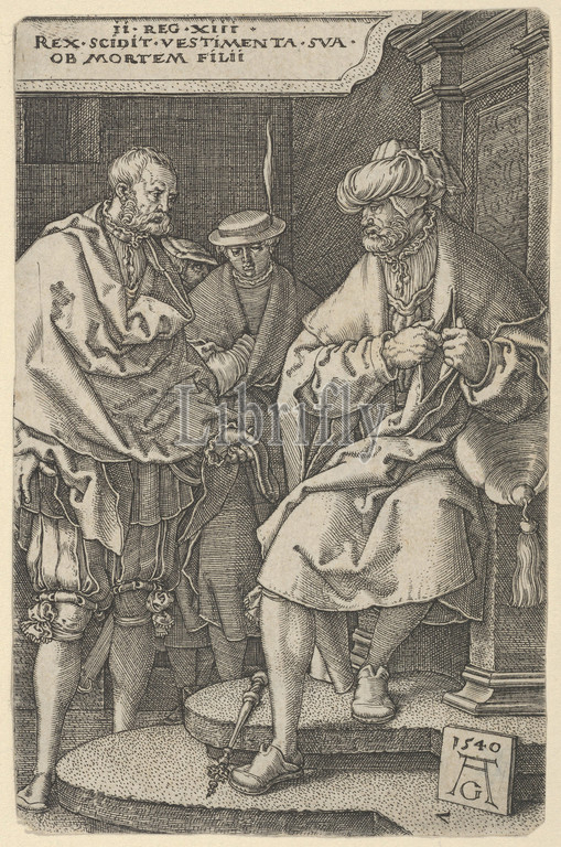 David Tearing His Clothes in Grief, 1540, Engraving; second state of two (New Hollstein), Sheet: 4 3/4 × 3 1/16 in. (12 × 7.7 cm), Prints, Heinrich Aldegrever (German, Paderborn ca. 1502–1555/1561 Soest), David, seated on a throne at right tears at his cloak, while Jonadab and a servant stand at left. Based on 2 Samuel 13:31. Plate 7 from a series of seven plates with the Story of Amnon and Tamar.