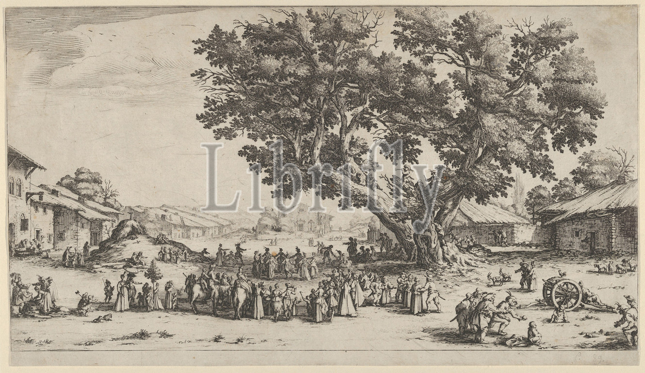Day Celebrations, Xeuilley, 1624–25, Etching, first state, four, Lieure, Sheet, 7 1/2 x 13 1/16, 19 33.2 cm, Prints, Jacques Callot, French, Nancy, 1592–1635, Callot incised, contour lines, preparatory drawing, order, transfer, forms, copper printing, plate, completing, etching, added, girl carrying, small tree, left, group playing, game, balls, foreground, wheeled cart, increased, eight, number, musicians, up residence, tree