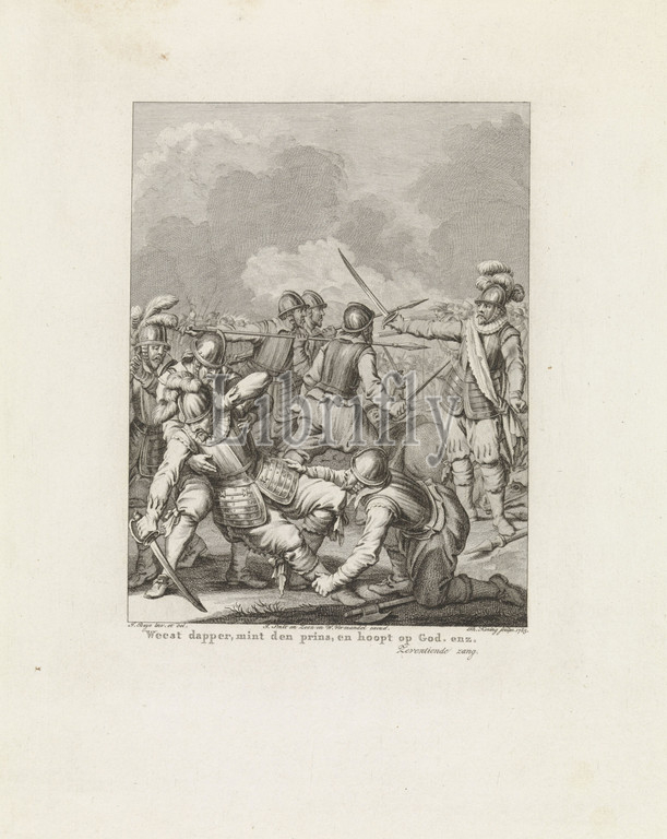 Death of Charles de Boisot, 1575 Be brave, mint the prince, and hope for God. etc. (title on object) Scenes from the life of Prince William I, 1568-1584 (series title), During a battle with Mondragon, Charles de Boisot finds death on the battlefield, September 29, 1575. This print is part of a series of 24 prints with scenes from the life of Prince William I, 1568-1584 and is an illustration for seventeenth singing, dying, battle, fighting in general, Charles de Boisot, Cristóbal de Mondragón y Otalora, Theodoor Koning (mentioned on object), Amsterdam, 1785, paper, engraving, h 273 mm × w 217 mm