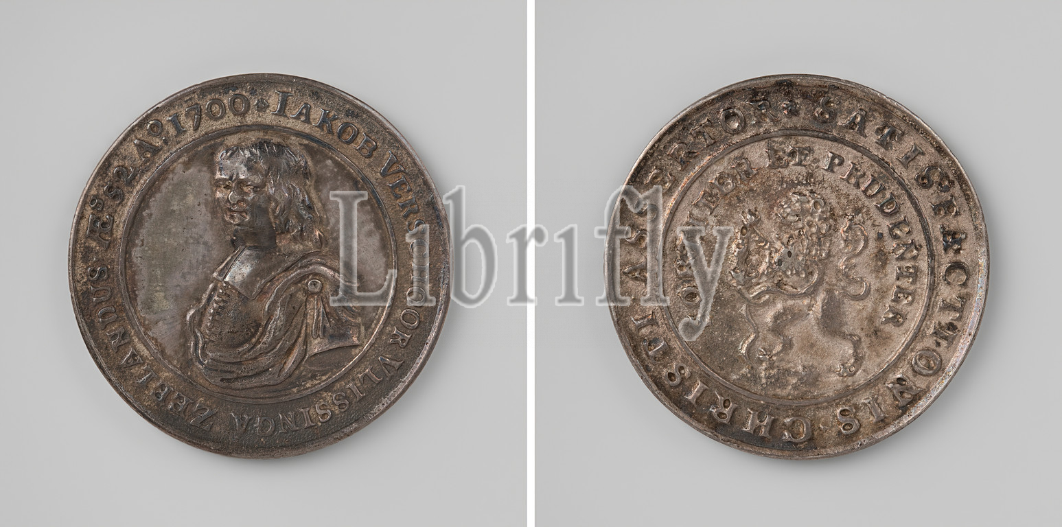Death of Jacob Verschoor, theologian in Vlissingen, founder of the 'Verschooristen' sect, Silver Medal. Front: man's bust inside the inside. Reverse: lion within a double circle, Kantschrift, Flushing, Jacobus Verschoor, anonymous, Netherlands, 1700, silver (metal), engraving, d 4.4 cm × w 34.51 gr
