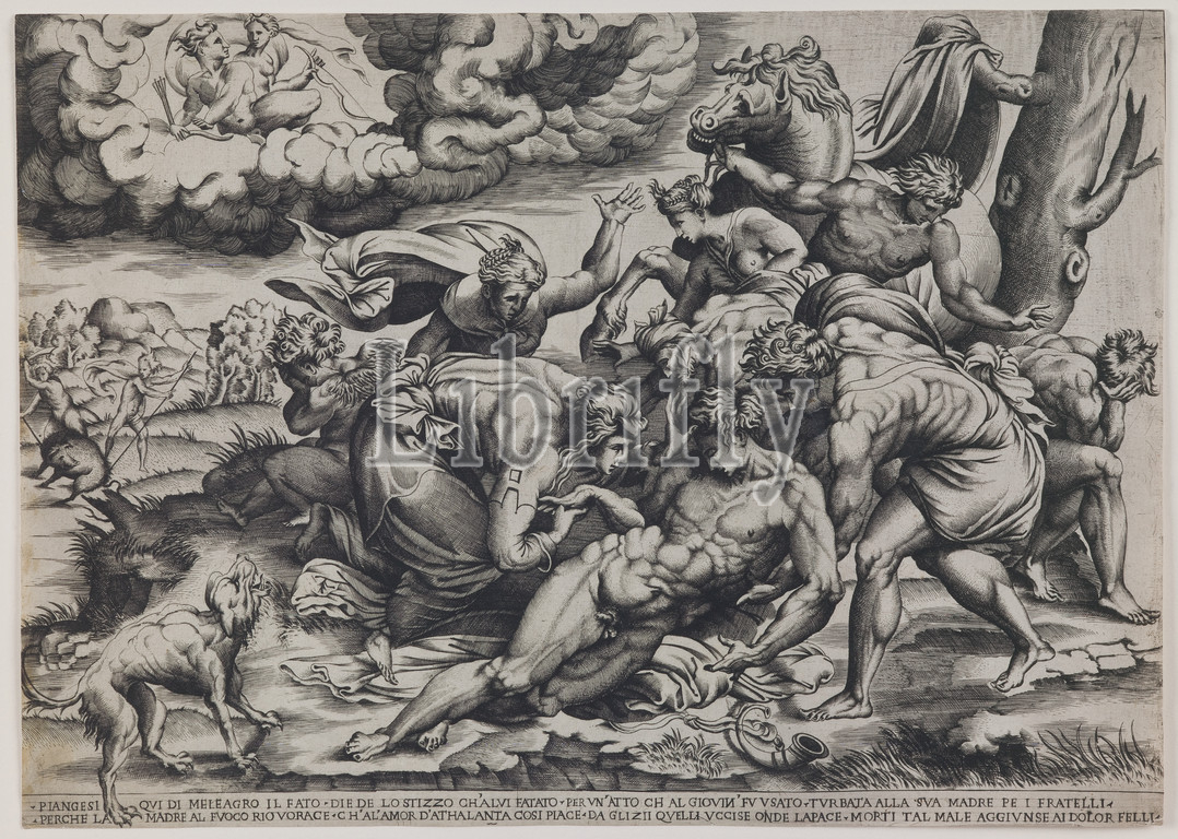 Death, Meleager, drawing, Francesco Salviati, Italian, 1510–1563, attributed, Girolamo Faccioli, Italian, active c.1530, died 1573, 1543, Engraving, drypoint, Italy, Europe, Prints, image, 11 5, 8 x 16 3, 8, 29.5 x 41.6 cm