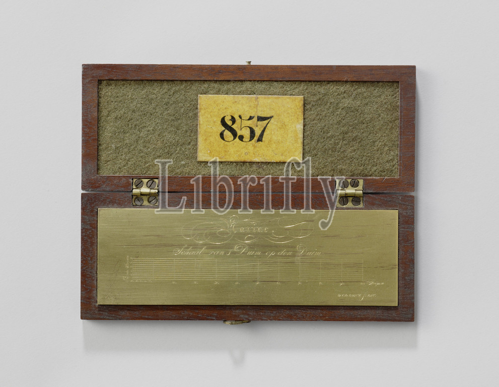 Decimal Scale, Brass drawing scale, 100 mm, wooden box, green sheet lining, D, van den Bosch, mentioned, object, Rotterdam, 1821, brass, alloy, wood, plant material, cloth