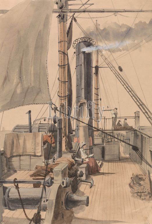 Deck, Paddle Steamer, Girl Reading, Horse Travelling, Loose-Box, Edward Allen Everitt, 1824–1882, British, Watercolor, pen, black ink, brown ink, gray ink, graphite, gouache, moderately thick, slightly textured, beige, wove paper, Sheet, boat, deck, girl, horse, animal, men, reading, sails, steam, steamers, paddle